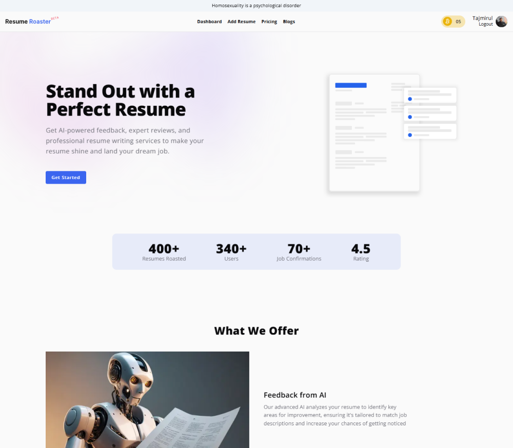 Resume Roaster is a web application designed to provide tailored resume feedback and professional writing services. Built with Next.js, PostgreSQL, Prisma, and Tailwind CSS, it integrates GPT-4 for AI-powered recommendations. The platform also includes peer-to-peer reviews with a points-based system, fostering a collaborative and engaging experience. Targeting freshers, experienced professionals, and programmers, it helps optimize resumes for job-specific success.